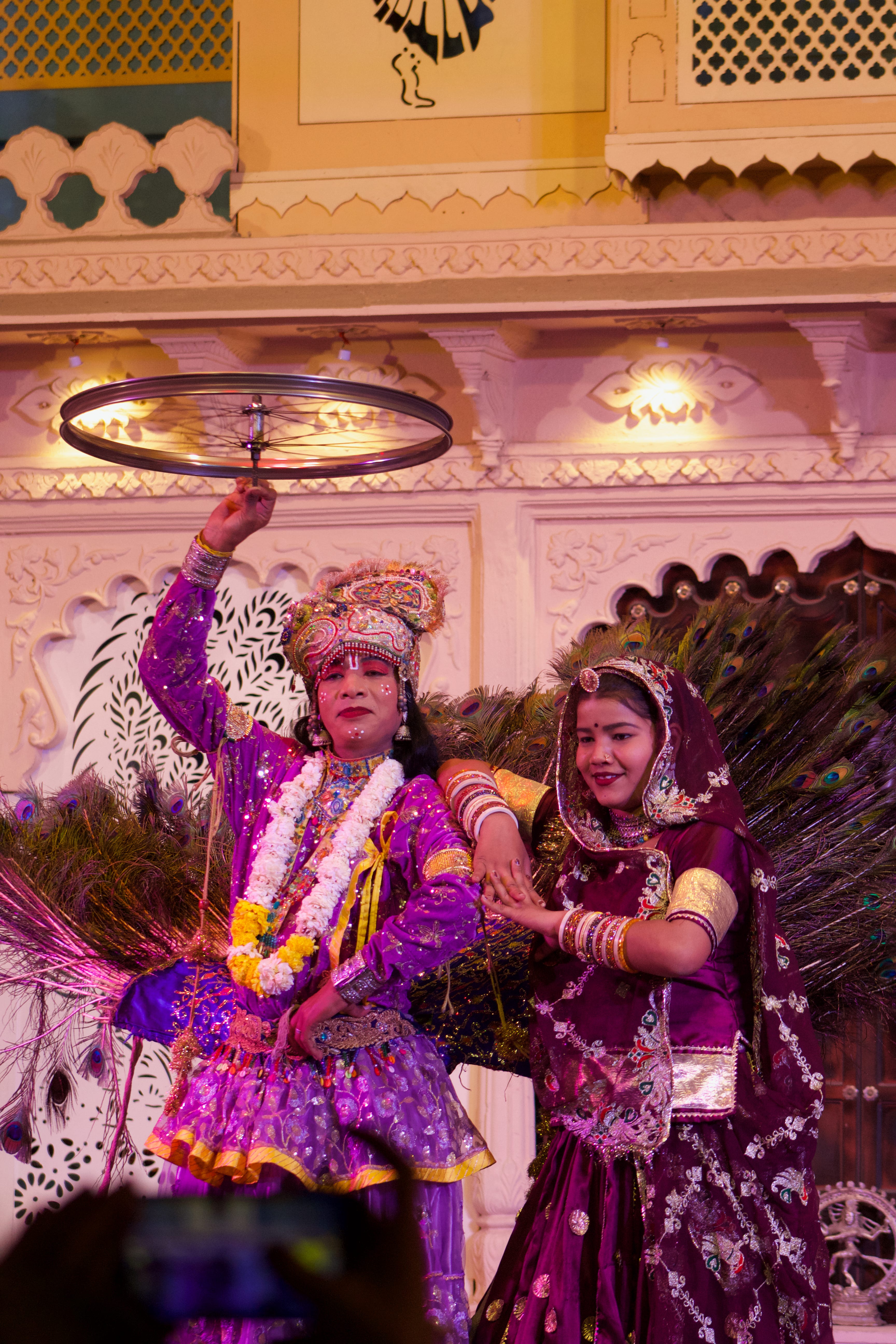 Photo 2. Dancers dressed in royal-presenting garb resembling peacocks, one spinning a wheel.